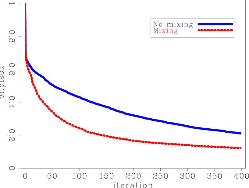 We show the results of running 400 iterations of minimizing equation 10 with and without the scale mixing described in equations 16 and 17. Figure 2 shows the normalized residual of the data fitting part, described by the first term of equation 10, as a function of iterations. The residuals of both inversions decrease monotonically without getting stuck in a local minima. However, scale mixing shows a much faster convergence rate.