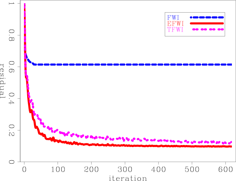 Figure 14. Graphs of data residuals as function of iterations for: FWI (blue), EFWI (red), and TFWI (magenta). |