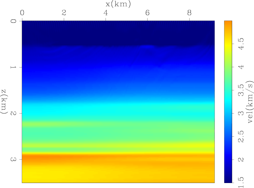 We compare the results of three inversion methods starting from the model shown in Figure 10, which was obtained by applying strong horizontal smoothing to the true model. Figure 11 shows the model obtained with conventional FWI; that is, by minimizing the objective function expressed in equation 1. As expected, conventional FWI fails because of its well-known difficulties with global convergence. The resulting model is almost identical to the starting one, with only a few shallow velocity discontinuities being imaged.