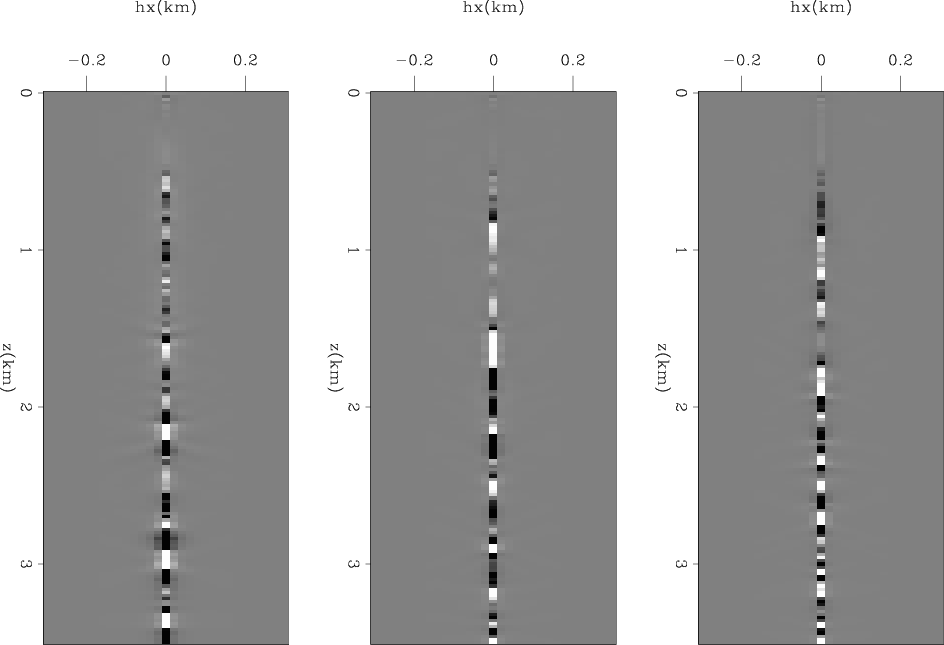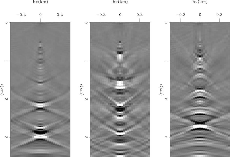 Figure 12 and 15 show the results of extended FWI (EFWI); that is, the minimization of the objective function expressed in equation 5. Figure 12 shows the zero subsurface offset section, displayed in color to facilitate the analysis of the long-wavelength components of the velocity. These components are similar in the final model and in the initial model. However, in contrast with the simple FWI, reflectivity is now imaged across the section, though misplaced and only partially focused because of the persistent errors in the long-wavelength components of the velocity. Figure 15 shows three sections of the difference cube obtained by subtracting the starting model from the final model. These sections are taken at fixed horizontal coordinates and are functions of depth and subsurface offset. These images are analogous to migration subsurface-offset common image gathers; they show the lack of focusing of the model along the subsurface-offset axis.