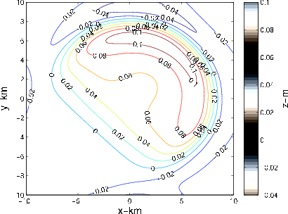 Contour plot of the displacements modelled from the asymmetric pore pressure decline of Fig 3(a).