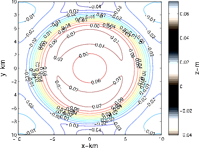 Fig 11 and Fig 12 show the results of modeling surface subsidence from the axisymmetric and asymmetric pore pressure decline synthetics of Fig 2(a) and Fig 3(a). Here $ N_z=20$ with a 100 m depth step, the displacement field at the depth of 2 km was computed using operator 5. Although the above approach allows both elastic medium parameters (e.g., shear modulus $ \mu$ and Poisson's ratio $ \nu$ ) to be vertically heterogeneous, the latter, as the ratio of the axial and transverse strains, is usually less affected by compaction, and hence we left it constant at $ .25$ . However, the depth-dependent shear modulus is given by the formula