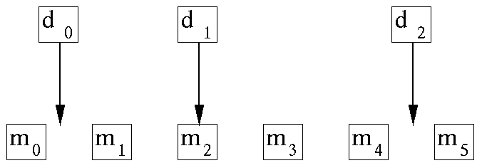 The linear interpolation operator is much like the binning operator but a little fancier. When we perform the forward operation, we take each data coordinate and see which two model bin centers bracket it. Then we pick up the two bracketing model values and weight each of them in proportion to their nearness to the data coordinate, and add them to get the data value (ordinate). The adjoint operation is adding a data value back into the model vector; using the same two weights, the adjoint distributes the data ordinate value between the two nearest bins in the model vector. For example, suppose we have a data point near each end of the model and a third data point exactly in the middle. Then for a model space 6 points long, as shown in Figure 4, we have the operator in (16).