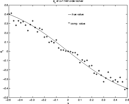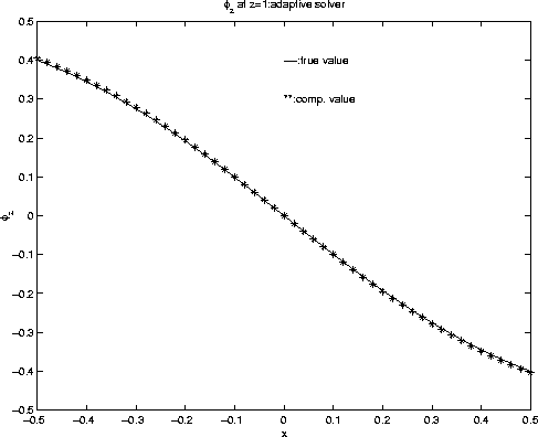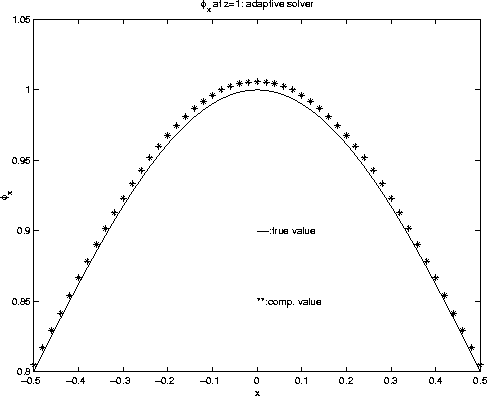 In this case, all the desired quantities have an obvious analytical solution to compare against the computed solutions. We compare the results obtained by two approaches, the first approach is computing all the quantities on the fixed output grid which reduces to be a first order method, the second is computing all the quantities by adaptive gridding. The ouput grid is