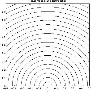 Figure 2 Traveltime for constant velocity model: adaptive grid | ![]() |