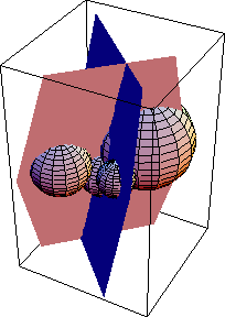 Five points on the current wavefront, represented by the five spheres, not all visible, with radii defined by the velocities at the corresponding points of the wavefront, are used to compute a point on the next wavefront. The sphere in the middle represents equation (3), while the planes represent equations (4) and (5).