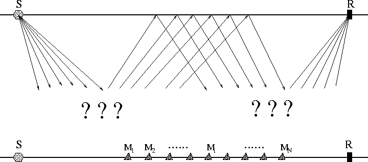 Figure 4 2-D multiple prediction. All the contributing traces form a 2-D MCG prior to summation. The question marks in the plot indicate that the underground structures are unknown. | ![]() |