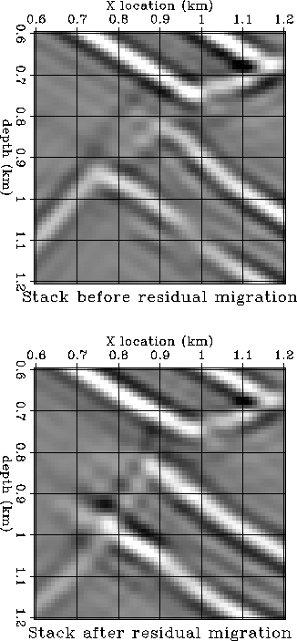 A simple visual analysis of the images before and after residual migration reveals the areas of improvement. First, the segment of the fault below the fast layer (labeled A in Figure 11) moves toward its correct position to the right, and in better alignment with the segment above the fault. Also, we can clearly identity the better focusing of the reflectors situated in the shadow zone (labeled B and C in Figure 11). These two events are also more closely aligned with their ideal location (Figure 3).