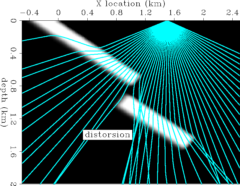 The model poses imaging difficulties because of the fast layer that is moved up along the reversed fault. Since the velocity in the layer is much faster than that of the surrounding material, the image under the upper section is expected to be heavily distorted when imaged with an approximate velocity. An easy way to highlight the distorsion zone is through wavefront tracing Sava and Fomel (1997), which has been shown to approximate wave propagation very well, even in regions of high velocity contrast (Figure 5).