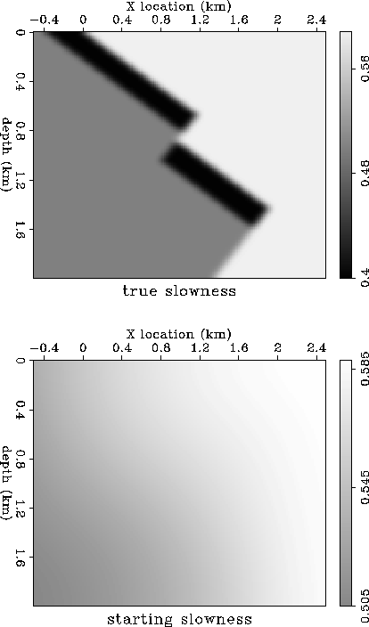 Figure 4 The slowness maps. The upper panel is the true slowness used to generate the data (Figure 6). The lower panel is the smooth slowness I used to create the starting image (Figure 7). The smooth model is obtained by heavily smoothing the true slowness model, with the fast layer removed. | ![]() |