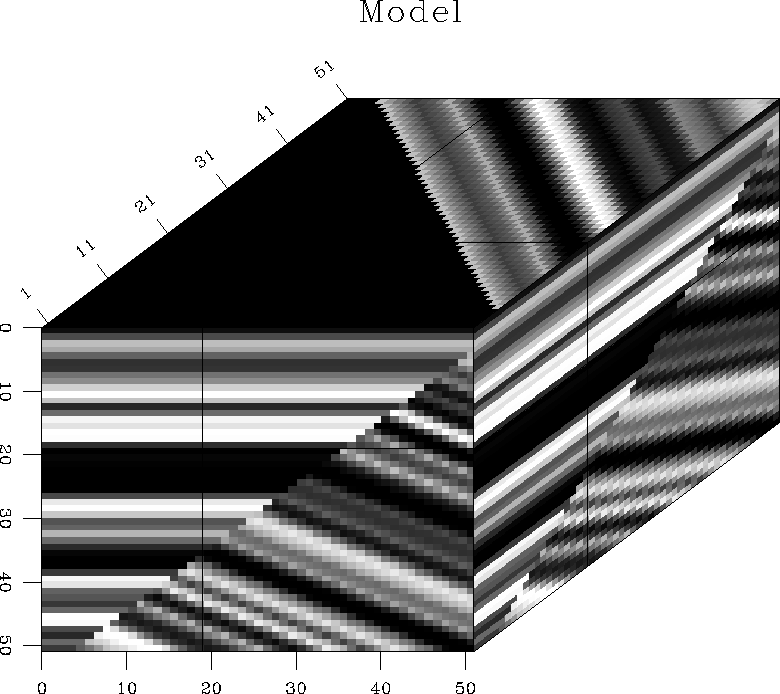 Figure 4 shows a simple synthetic model of two plane waves, separated by a plane fault. The slope estimates for the two orthogonal directions are shown in Figure 5. We can see that the estimation procedure correctly identified the regions of constant slope. Finally, estimating a local 3-D plane-wave predictor by spectral factorization and convolving the resultant non-stationary filter with the input model, we obtain the prediction residual, shown in Figure 6. In the residual, both plane waves are effectively destroyed, and we observe a sharp image of the fault plane. This result compares favorably with results of alternative methods, collected by Schwab (1998).