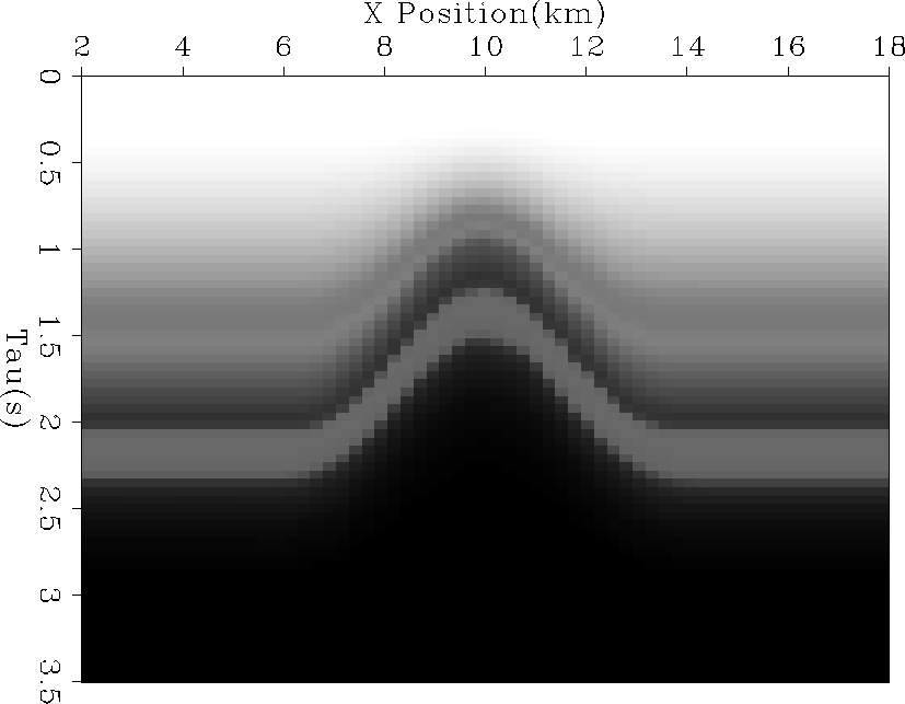 For this simple model, we will use as our conception of geology a vertically warped version of our initial velocity estimate. We measure how much a migrated reflector positions varies from our initial flat estimate. Figure 13 shows our initial estimate.