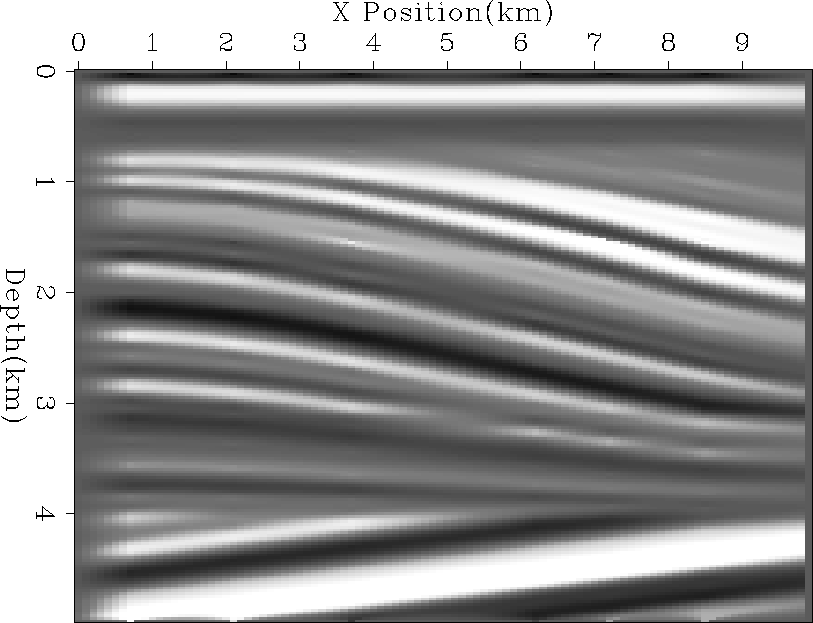 If we assume that velocity follows structure and we have some guesses at reflector position, we can use this information to build our steering filters. For this problem we will assume that we have the location of four reflectors, one above the top unconformity, two between the unconformities and one below the lower unconformity (left-panel of Figure 6). If we interpolate these dips to our entire model space we have all we need to construct a space-varying operator composed of steering filters. If we use this operator as our regularizer, we get Figure 7 as our interpolation result. The steering filters did a significantly better job than the isotropic regularizer.