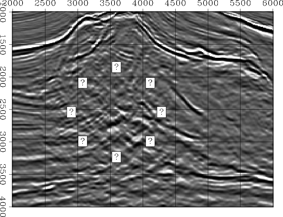 Figure 6 Zoom over the area of major blur. The goal of the residual migration is to shed as much light as possible over the region encircled with question marks.