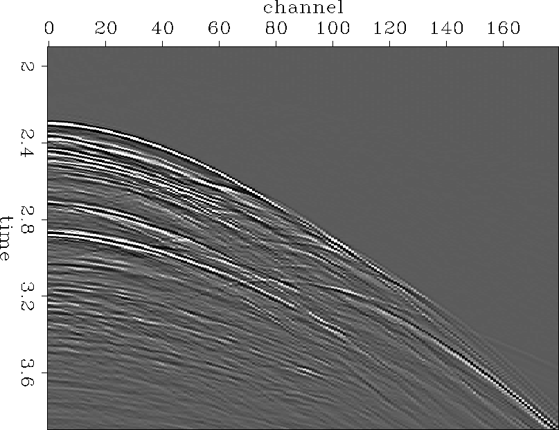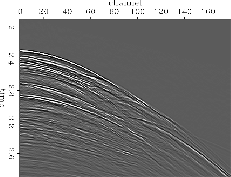 As a test, we interpolate both ways. Figure 355start.shot shows a closeup of the input, zoomed in on regions between 2 and 4 seconds in Figure 355exshotgather. Figure 355shotsub.out.shot shows the interpolation result on common shot gathers. Figure 355recsub.out.shot shows the interpolation result on simulated common receiver gathers. The traces shown in Figure 355recsub.out.shot are the same as in the other figures, but traces were zeroed in a checkerboard pattern (as in Figure traces-crg) to simulate the pattern of known and missing traces that arises from forming common receiver gathers after throwing out every second shot. In the other case, where the data are just representing shot gathers, every second slice in the cube was zeroed (as in Figure traces-csg).