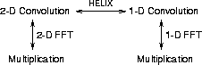 The Fourier analogue of convolution is multiplication: to convolve a 2-D signal with a 2-D filter, take their 2-D Fourier transforms, multiply them together and return to the original domain. The relationship between 1-D and 2-D convolution, FFT's and the helix is illustrated in Figure 1. With helical boundary conditions, we can take advantage of the isomorphism described above, and perform multi-dimensional convolutions by wrapping multi-dimensional signals and filters onto a helix, taking their 1-D FFT's, multiplying them together, and then returning to the original domain.