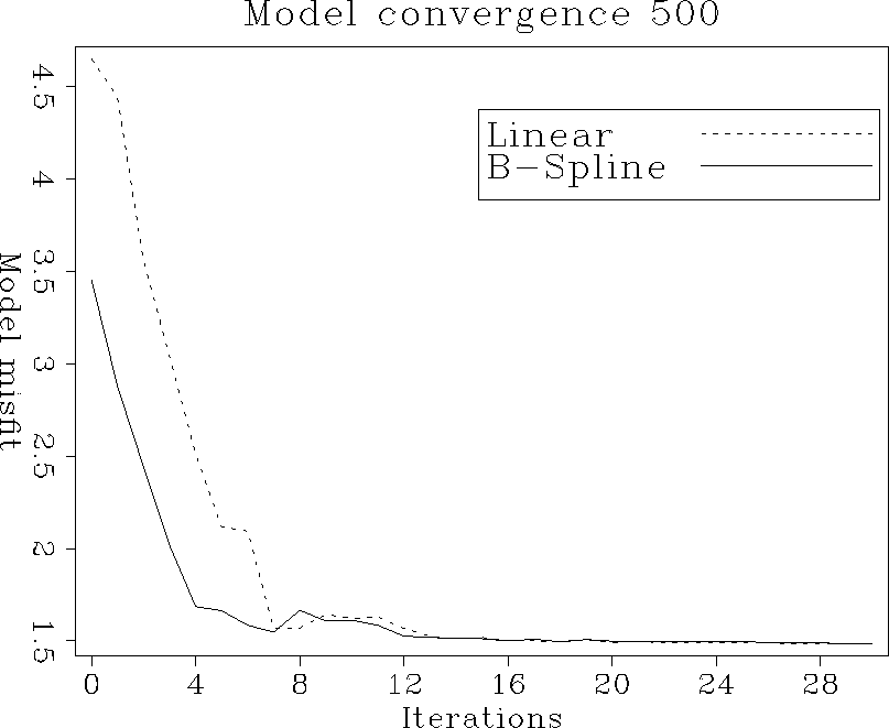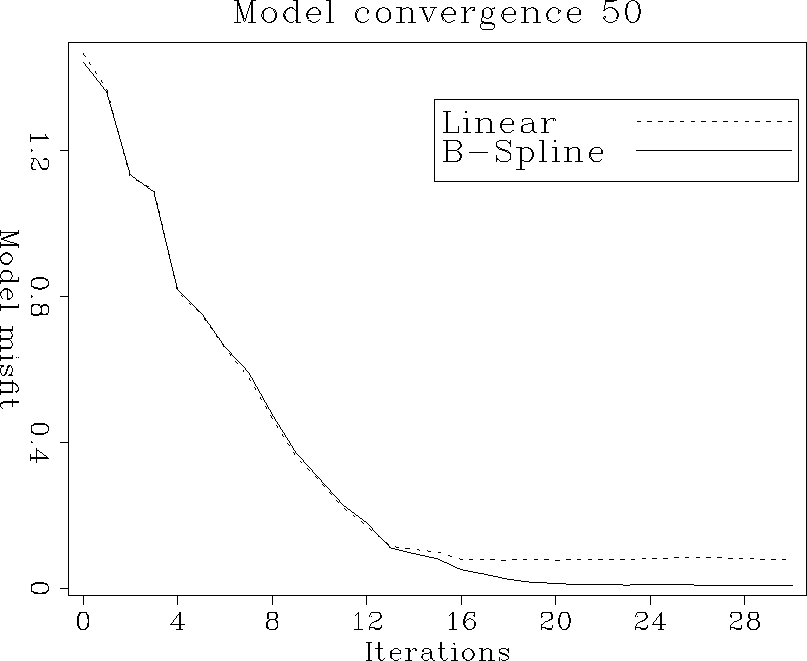 The least-squares differences between the true and the estimated model are plotted in Figures [*] and [*]. Observing the behavior of the model misfit versus the number of iterations and comparing simple linear interpolation with the third-order B-spline interpolation, we discover that