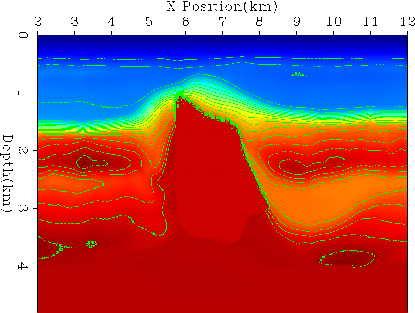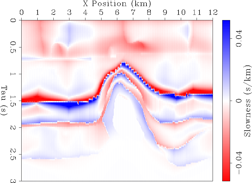 Using fitting goals (1) I estimated a new velocity model. Figure 8 shows the slowness perturbations introduced to the model. Note how the changes generally follow structure. If we add these slowness changes to the initial slowness model and convert back into depth we get Figure 9. Our updated velocity model is smoother than the initial model (Figure 2). The chalk layer velocity has been increased and the sediment velocity along the lower left flank of the salt has been increased.