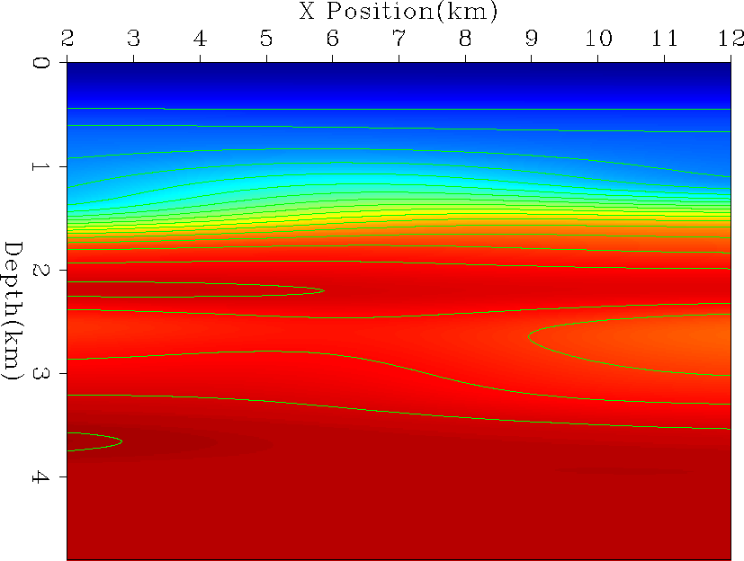 The method presented in this thesis is an attempt to combine the best features of layer and grid based tomography. In the previous section I started from a model derived using a layer-based approach. As a result the changes were not only small amplitude (because of the good starting guess) but also relatively high frequency. In this section I take a different tack. I use the same data, but start from a vastly different velocity model (Figure 17). The velocity model was constructed by first drastically smoothing the initial model used in the previous section (Figure 2). I then migrated with this velocity, picked the salt boundaries, and added in the salt structure. Using this velocity model I then remigrated the data (Figure 18). The top of the salt is extremely messy and the bottom of the salt is not flat and low in amplitude. We see little below the fault at x=10 km and little of the reflections below the salt edge.