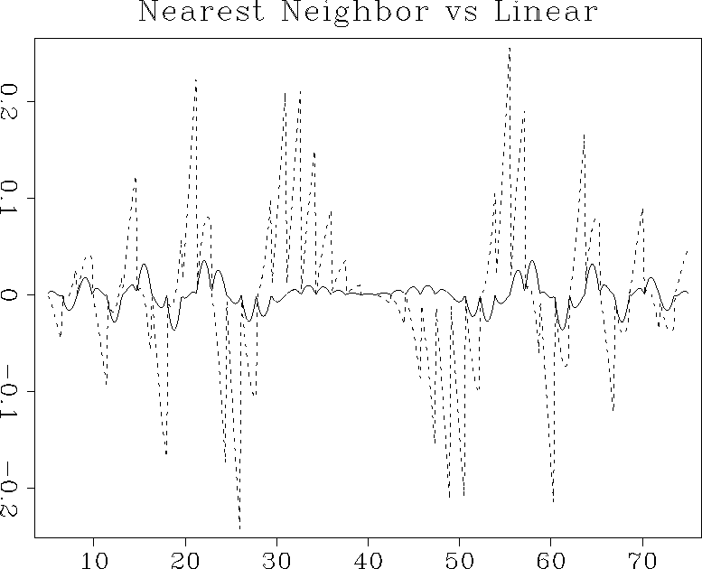 Figure 5 Interpolation error of the nearest-neighbor interpolant (dashed line) compared to that of the linear interpolant (solid line). | ![]() |