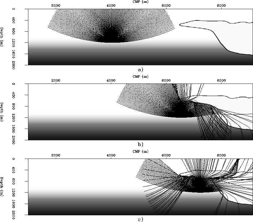 Figure 2 Different ray tracing for different reflector position. a) A reflector position not affected by the salt body; b) A reflector position partially affected by the salt body; c) A reflector position totally affected by the salt body. | ![]() |