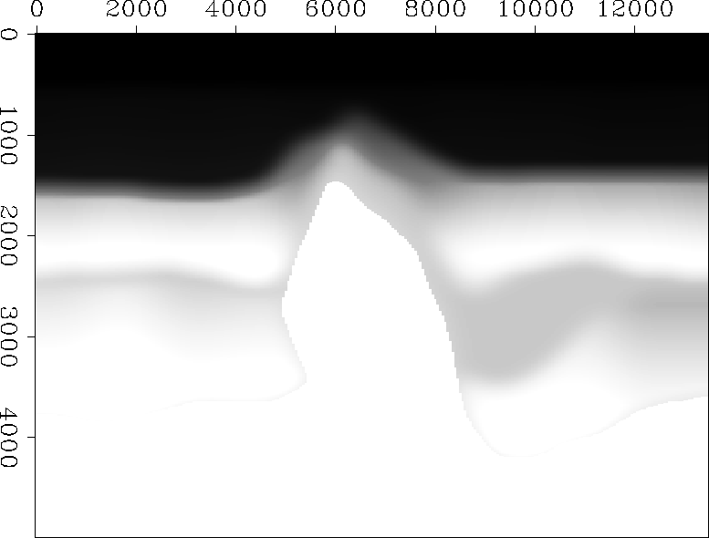 Dip fields, described in Fomel (2000) can be helpful in interpreting seismic data. Fig. 5 shows the value of the strongest dip in the corresponding point of Fig. 4, computed with the programs accompanying Fomel (2000). It is not easy to visually correlate the features in the two images. But when the dip field is used for chrominance, and the seismic image for luminance (with the operator M containing a 97 percent clip before applying jet colormap), the unconformities, as well as the areas with conflicting dips, become highly visible. (Fig. 8)