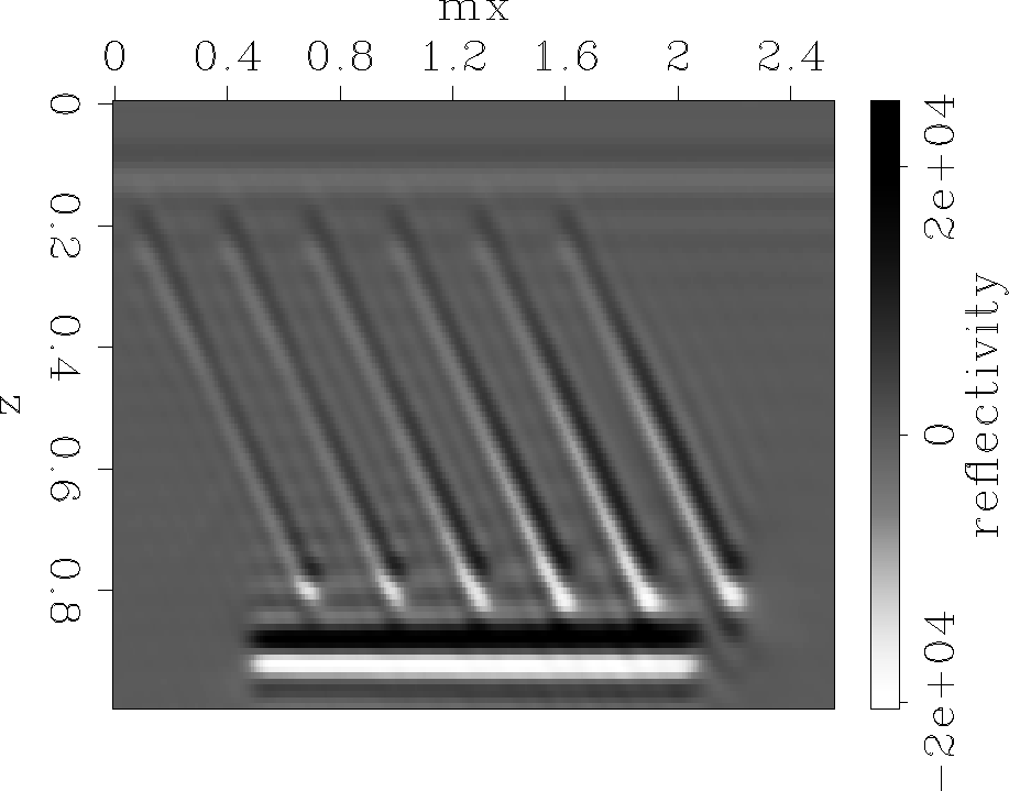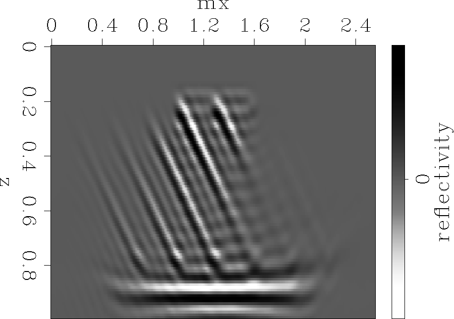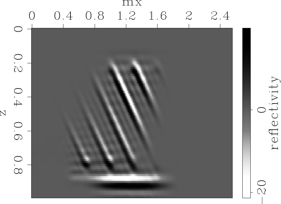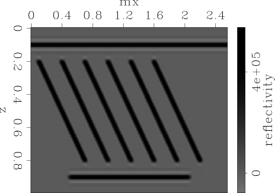 In this section, we demonstrate the method on a synthetic example. The reflectivity model (Figure 1) consists of two flat reflectors surrounding a set of reflectors dipping at 45 degrees.