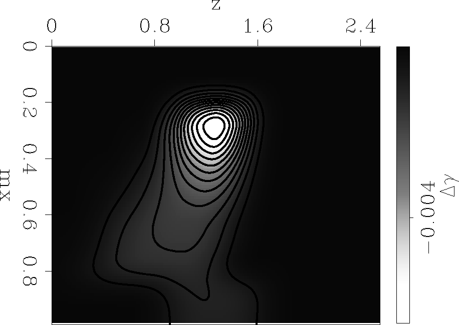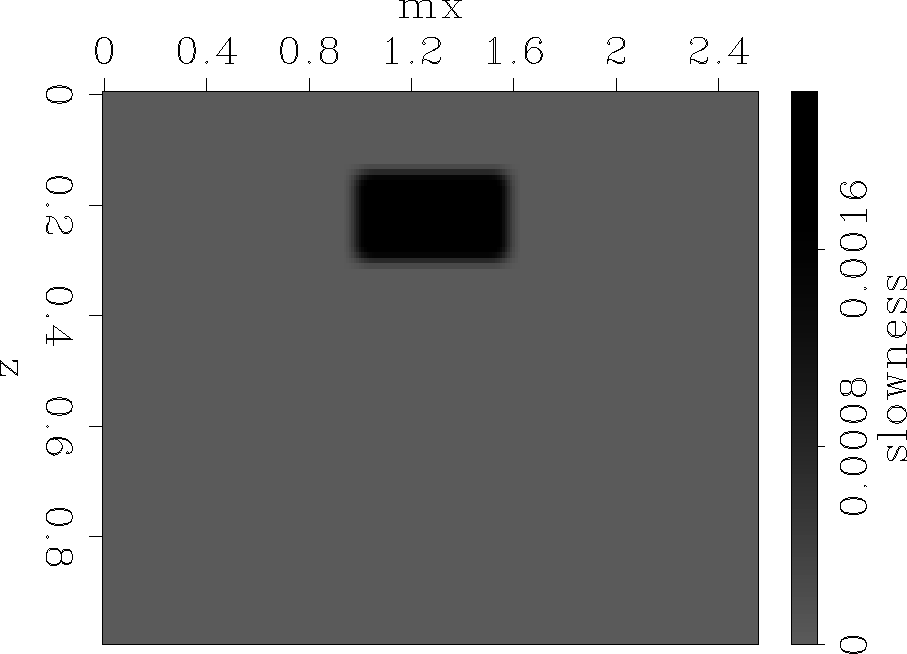The image perturbation (Figure 3) consists of a rectangular block in the upper part of the section, which creates perturbations in the image both on the flat and on the dipping reflectors. We change the magnitude of this anomaly from small values that satisfy the Born approximation, to high values that clearly violate the linear assumptions.