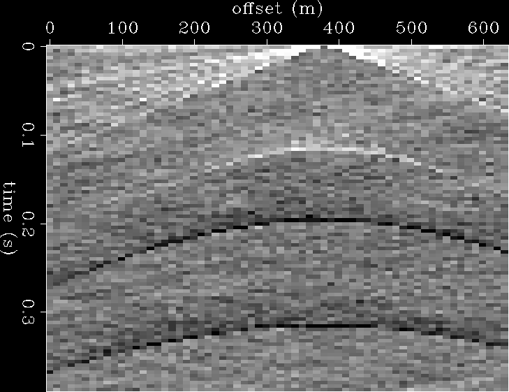 Figure 2 Representative pseudo shot gather from data cube generated by cross-correlating all traces from a modeled passive seismic dataset. The raw data trace that has been correlated with all the others serves as the source location for the gather. Notice the ``virtual multiple'' at 0.11 seconds. This arises due to the partial correlation of the two reflectors between themselves. The greater the velocity contrast, the less visible this event. Its zero-offset time is equal to the difference in time between the two events. | ![]() |