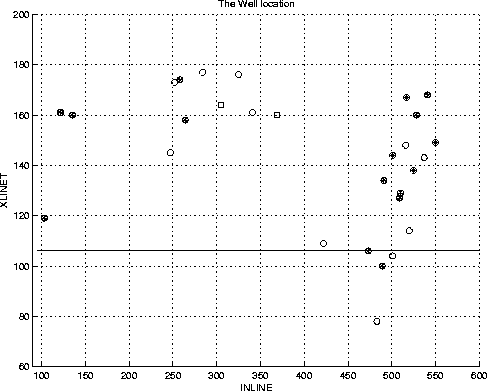 Figure [*] shows the well locations in this area. The straight line is where we will extract seismic amplitude information. The line was chosen by matching the wells A, B and C using linear least square method, resulting in coordinate as cross-line=106.33 (CMPY=2.225km). Table 1 is the detailed information of the coordinates of three wells used to match the line.