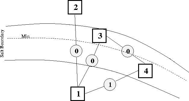 Figure 1 A cartoon illustrating some sample weights on the negative instantaneous amplitude. Several pixels are shown in squares and their corresponding weights in circles. The salt boundary is defined as areas where the negative instantaneous amplitude is below a threshold. |