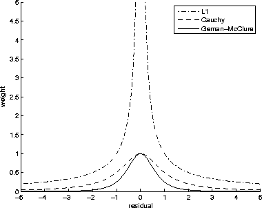 . Notice that the Geman-McClure creates the tightest, most precise weight. This should have the advantage of having a surgical-like effect of down-weighting spurious dips.