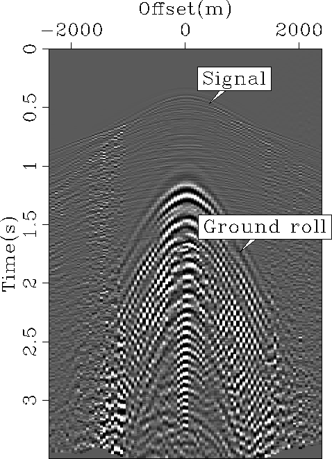Figure 3 Shot record from a land acquisition in Saudi Arabia. The strong ground roll, although containing valid near-surface information, is often attenuated. The signal on the top needs to be isolated for further processing. | ![]() |
