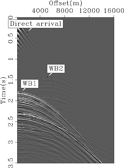 Figure 2 Marine seismic record with two water bottom reflections WB1 and WB2. WB1 is generated by the airgun towed by a seismic vessel. WB2 is created by a noisy source within the water column at offset 5000 m. The origin of this source is unknown. | ![]() |