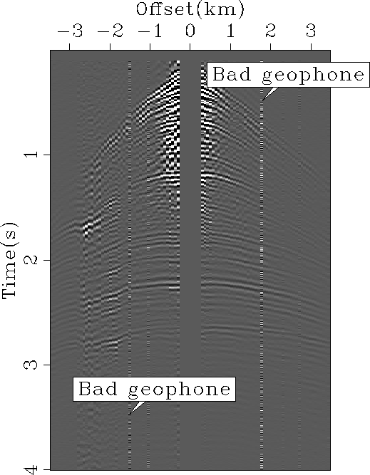 Figure 1 Land seismic record with few bad geophones. | ![]() |