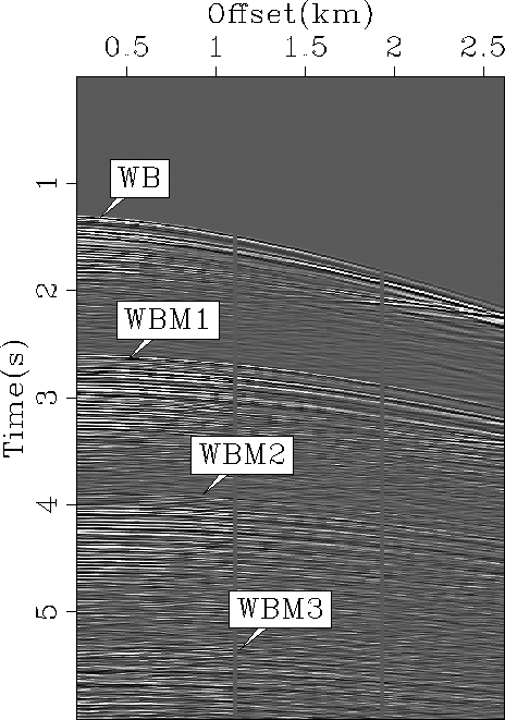 Figure 4 Shot record from a marine acquisition in the Gulf of Mexico. The first reflections (WB) on the top, also known as primaries, are immediately followed by multiple reflections (WBM1, WBM2 and WBM3). An important step in seismic processing is to attenuate these multiples before migration to isolate the primaries. | ![]() |