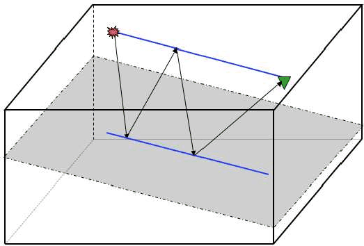 For all other source-receiver azimuths and for water-bottom with crossline dip, the multiple reflection path can no longer be considered a simple extension of the 2D case via a rotation of coordinates. The ray from the source to the reflector to the surface is contained in the plane normal to the reflector as required by Snell's law. On the other hand, the ray from the bounce point at the surface to the reflector to the receiver cannot be contained in the same plane since the surface is flat and therefore its normal is vertical. This reflection has to be contained in a vertical plane. This means that the surface bounce cannot lie in the line that joins the source and the receiver (see Figure 4). The coordinates of the bounce point at the surface, the coordinates of the reflection points on the water-bottom and the traveltime of the multiple can be computed with the equations given by ().