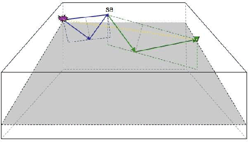Figure 4. Raypath for a 3D Water-bottom multiple from a water-bottom dipping in the crossline direction only. The multiple propagation is not entirely contained in one plane. The ray from the source to the reflector to the surface bounce (SB) define one plane while the ray from the surface bounce to the reflector to the receiver is contained in a different plane. |