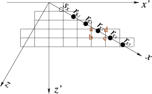 Their wavefield values must be interpolated onto regular grids around the slanted line in tilted coordinates. The wavefield on is interpolated onto the grids a, b, c, and d.