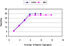 3D convolution using different number of computation cores on an FPGA. The FPGA circuit is running at 125 MHz. The speedup is calculated against a single-core software implementation running on Intel Xeon 2.0 GHz. Due to the constraint of logic slices, the FPGA can fit six concurrent `cube' stencils or eight concurrent `star' stencils. For all the different number of stencil operators, the `cube' provides a slightly better performance than the `star'. Both the `cube' and the `star' arrive at the saturation point of around 25x speedup with four stencil operators.