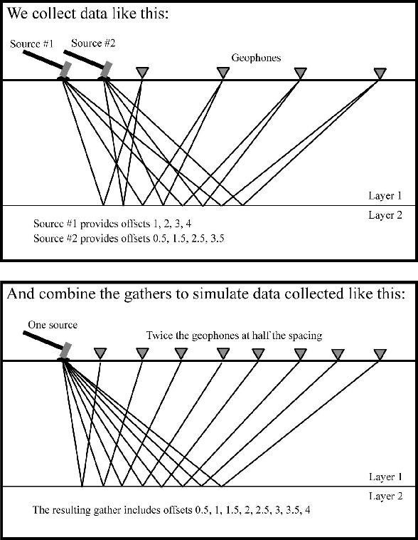 channel array was simulated, illustrated schematically in Figure 1. This approach is a variation on the ``walk-away'' testing that is commonly used for acquiring data at a new field site. The interleaving technique assumes that geology does not vary too rapidly along the transect. Any lateral geological variation would violate this assumption, and cause artifacts in the shot gathers.