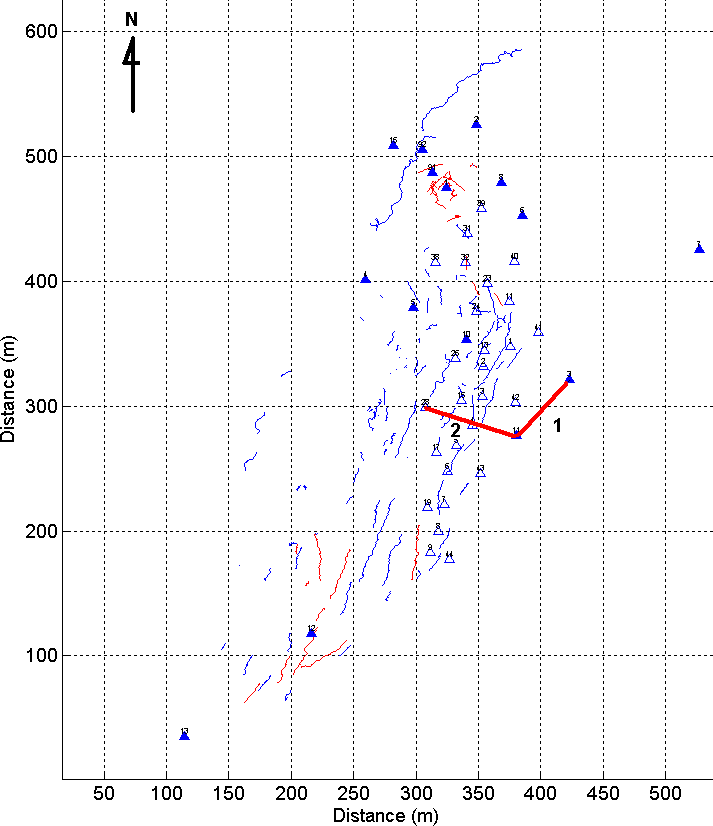 Figure 2. Site map with fissures (thin lines), wells (full triangles), thermocouples (open triangles) and seismic lines (thick lines). Courtesy of Taku Ide.