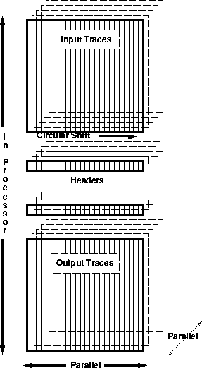 Figure 2 Data mapping for the parallel Kirchhoff datuming algorithm. The vertical direction is in-processor, horizontal and depth directions are parallel. Each plane in the first parallel direction represents one shot or receiver gather. All computations are performed in-processor. The input traces and input headers are circularly shifted in the parallel direction as indicated by the arrow. | ![]() |