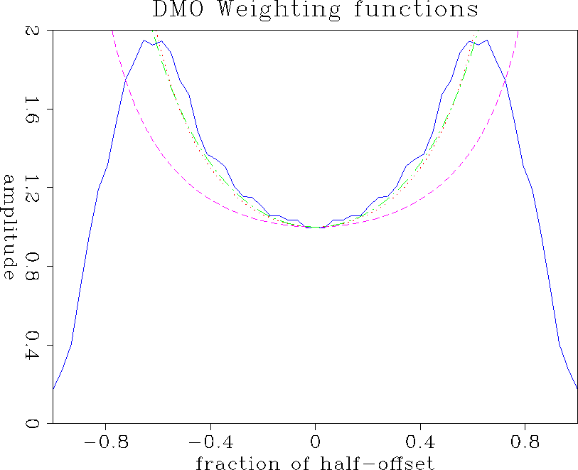 Rule 1. Figure (3) shows the comparison of the different weighting schemes normalized by their value at x=0 with the amplitude picked along the impulse response of an (f,k) DMO program (Zhang's formulation). The different curves agree in shape, their concavity turned upward. However, Black's and Beasley's schemes are closer to the (f,k) DMO amplitudes. The decrease in amplitude of the (f,k) amplitude when x increases is caused by the velocity-dependent dip limitation of the operator. The three weighting functions have been plotted up to x=h without taking the limitation into account.