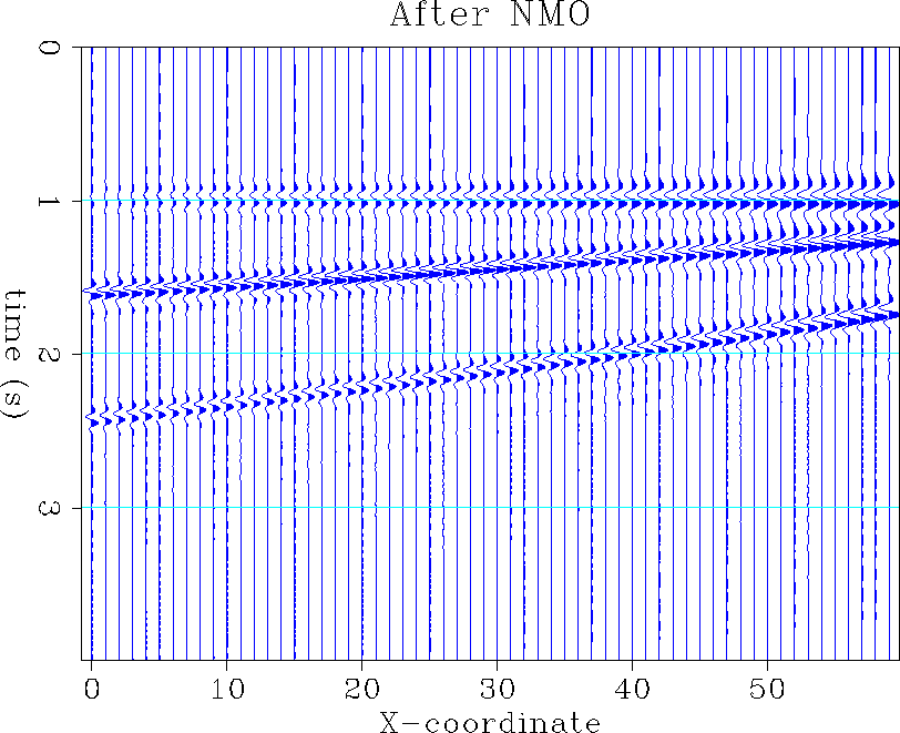 Rule 3. In order to verify the third rule, I used a 3-D synthetic dataset created by David Lumley. Figure (5) shows an NMO-corrected section of the model for a shot located at x = 0. The structure is composed of three planar reflectors: a horizontal reflector showing some AVO effect (the amplitudes increase away from the source) and two shallow, dipping reflectors (15 and 30 degrees).