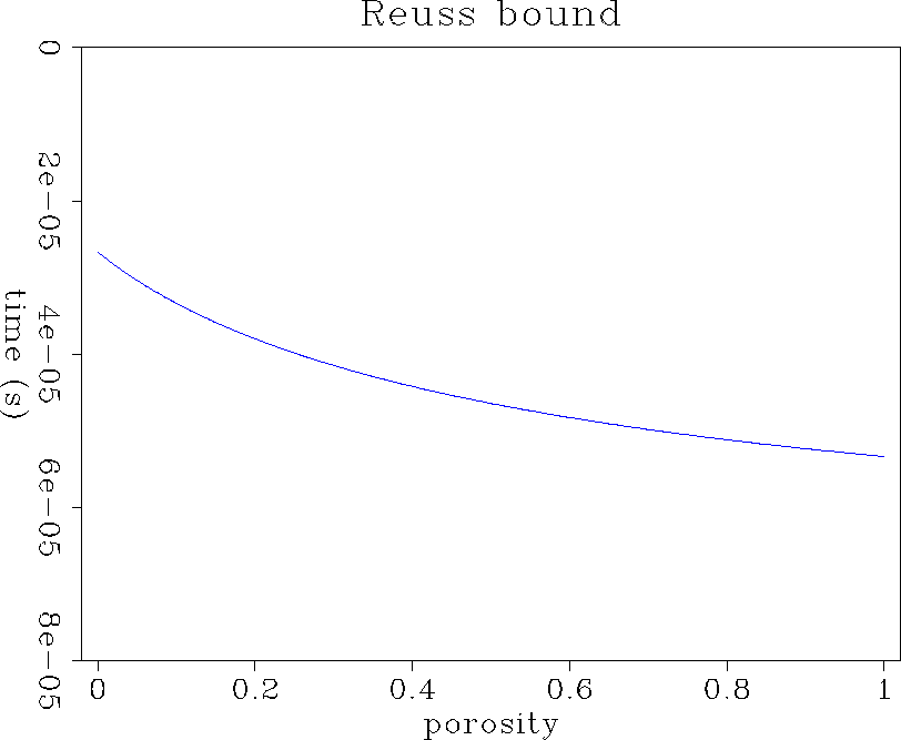 Figure (4) displays the Reuss bound (equivalent to Wood's relation) for the velocities of the model. By mentally overlaying the curve to the synthetic seismogram in Figure (3), we can notice that the first peaks lie close to the curve. Unfortunately, they do not exactly fit the Reuss bound, mainly because the program only models P-velocities.