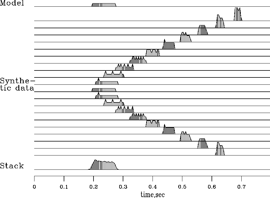 Notice the roughness on the waveforms caused by different numbers of points landing in one place. Notice also the increase of AVO (amplitude versus offset) as the waveform gets compressed into a smaller space. Finally, notice that the stack is a little rough, but the energy is all in the desired time window.