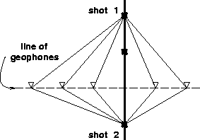 Figure 1 This simple 3-D land acquisition geometry exhibits the non-recurrence of the shot profiles. As opposed to marine surveys, the geophone line does not move along with the shot location. | ![]() |
