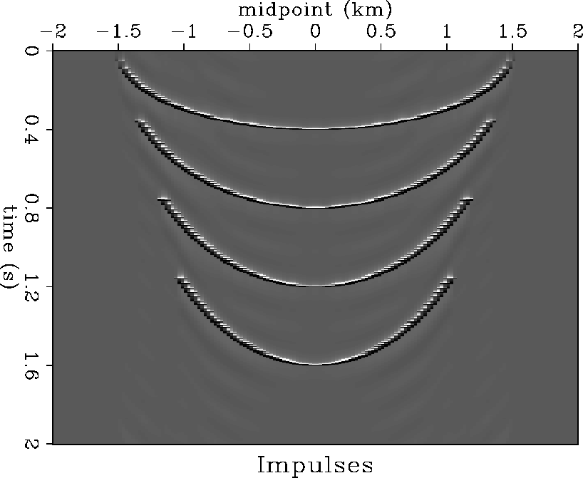 Figure 6 Impulse responses of DMO applied to time slices. The anti aliasing triangles are wide at gentle dips and shrink towards the steepest dips. | ![]() |