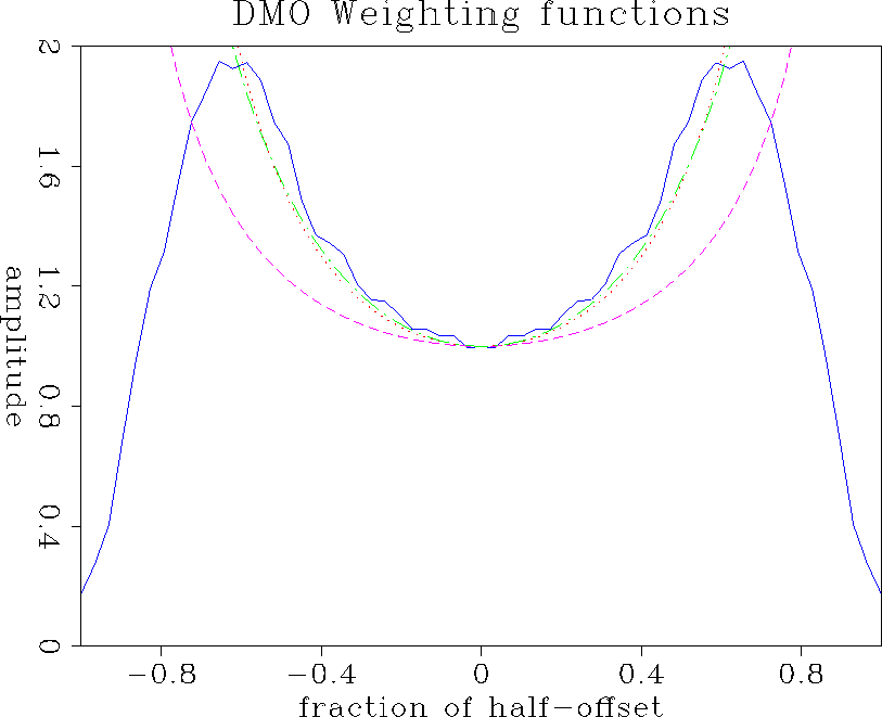 Rule 1. Figure (Amp) shows the comparison of the different weighting schemes normalized by their value at x=0 with the amplitude picked along the impulse response of an (f,k) DMO program (Zhang's formulation). The different curves agree in shape, their concavity turned upward. However, Black's and Beasley's schemes are closer to the (f,k) DMO amplitudes. The decrease in amplitude of the (f,k) amplitude when x increases is caused by the velocity-dependent dip limitation of the operator. The three weighting functions have been plotted up to x=h without taking the limitation into account.